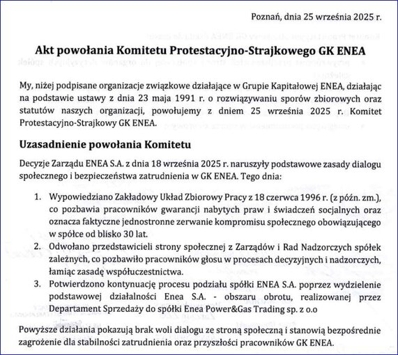 25 września 2025 r. to dzień przełomowy dla pracowników Grupy Kapitałowej ENEA. Tego dnia organizacje związkowe powołały Komitet Protestacyjno-Strajkowy GK ENEA – w obronie praw, godności i przyszłości tysięcy zatrudnionych. To odpowiedź na bezprecedensowe decyzje zarządu spółki, które łamią wieloletni kompromis społeczny i zagrażają bezpieczeństwu pracy.