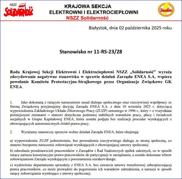 Rada Krajowej Sekcji Elektrowni i Elektrociepłowni NSZZ „Solidarność” wyraża zdecydowanie negatywne stanowisko w sprawie działań Zarządu ENEA S.A, wspiera powołanie Komitetu Protestacyjno-Strajkowego przez Organizacje Związkowe GK ENEA.